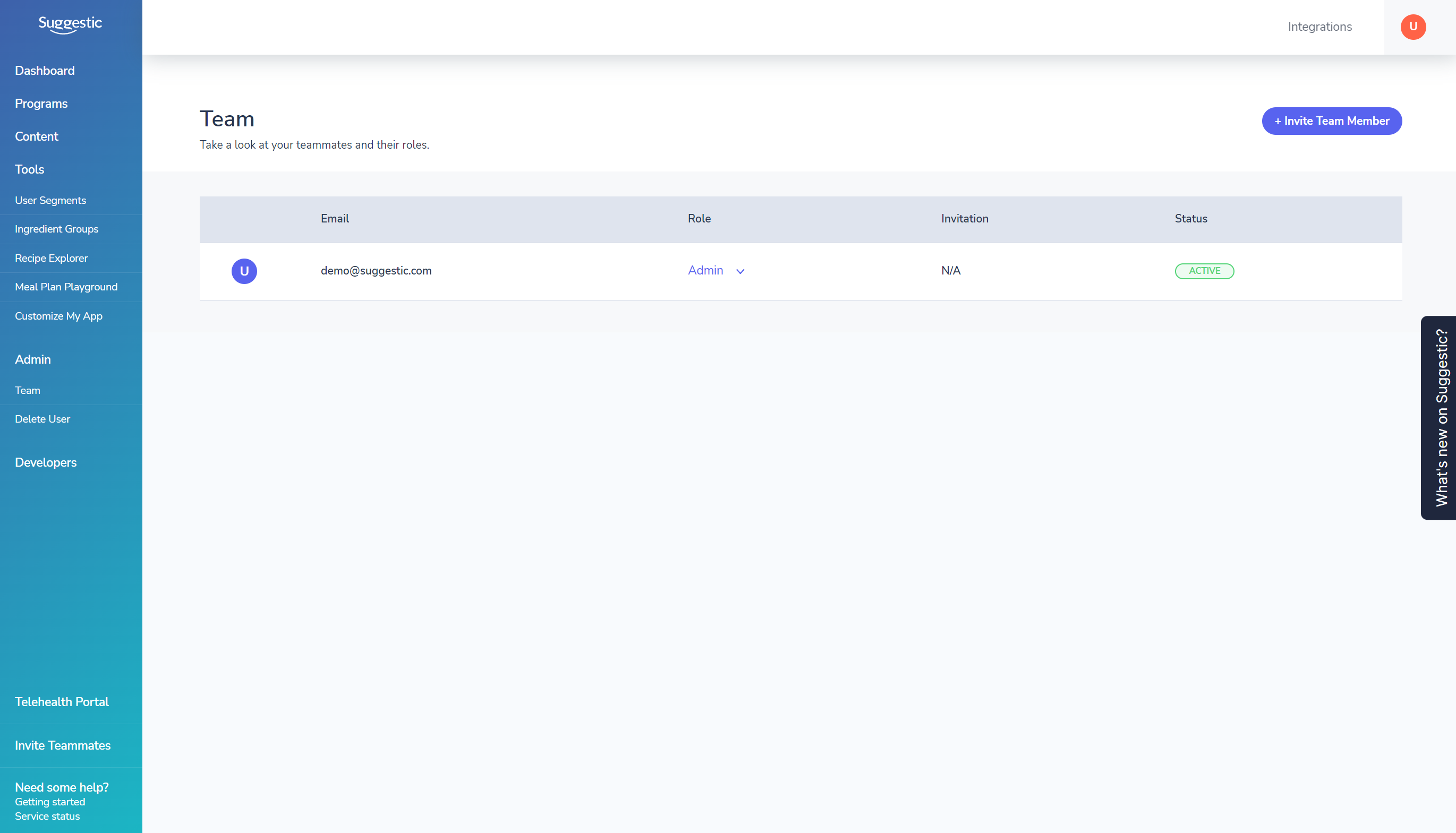 To invite a new Console user, navigate to the [Team page](https://console.suggestic.com/team) and click the "Invite a Team Member" button.  This action is only available to users with the Admin role.
